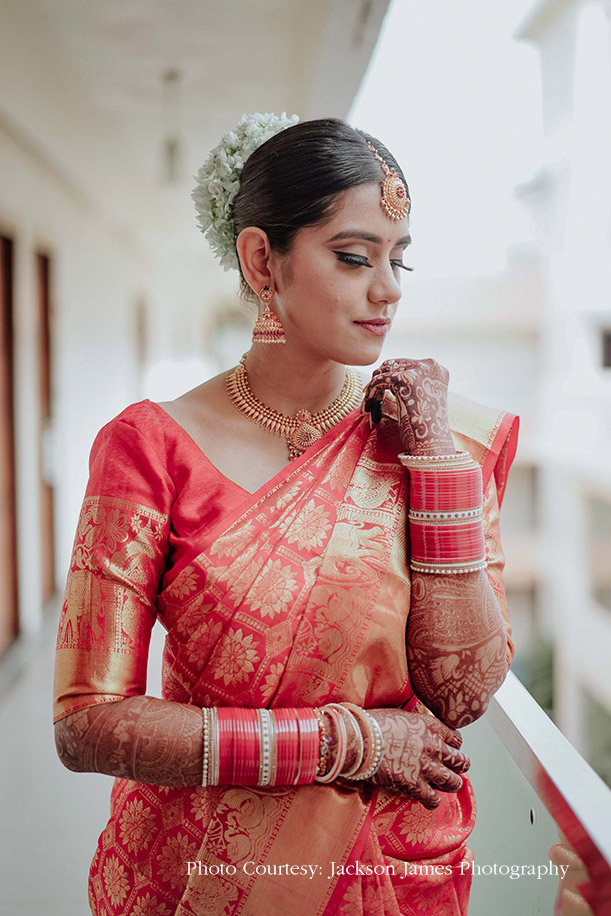 Staying true to tradition, for the Malayali wedding, Ravneet chose to don a red saree that reflected the traditional Malayali bride. She shares, “I wanted the entire look to be authentic and hence, chose a red Kanjivaram saree with beautiful gold zari work and accessorized it with South Indian jewelry. I also wore a fresh mogra gajra in my hair which contrasted wonderfully with the rich red hue of the saree.”