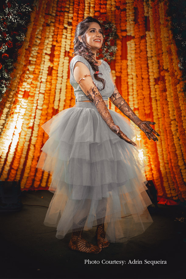 Ravneet shares, “For the Mehndi/Sagan ceremony I wore a dress that I designed myself. I visualized something gorgeous yet comfy with a distinct indo-western vibe to it, I customized a tulle high-low skirt with a sequined crop top. We also kept the makeup very natural for optimum comfort, and my makeup artist perfectly enhanced my eyes with beautiful glitter eyeshadow.”