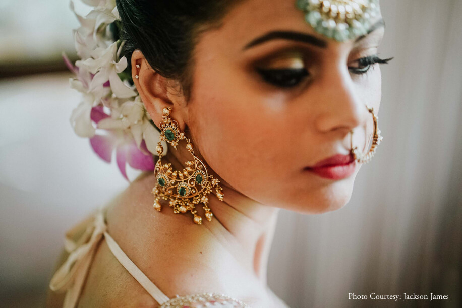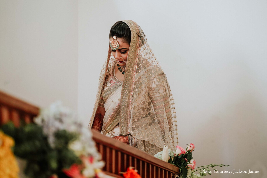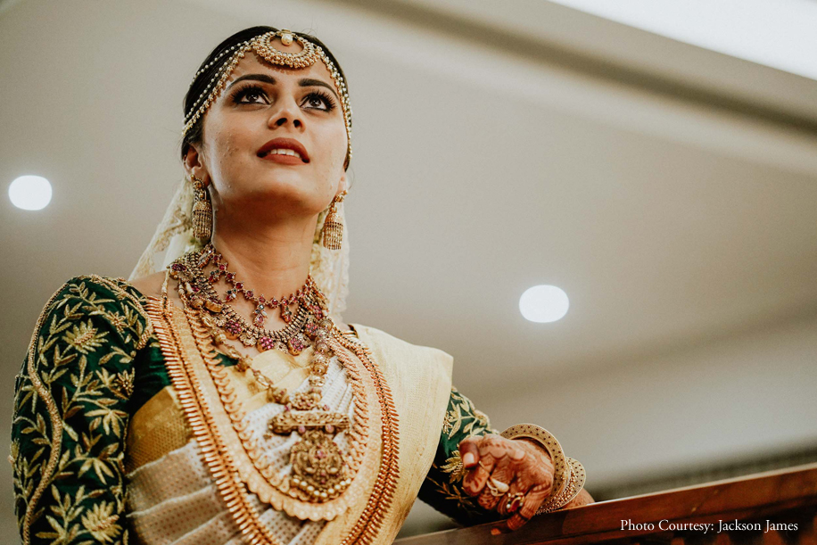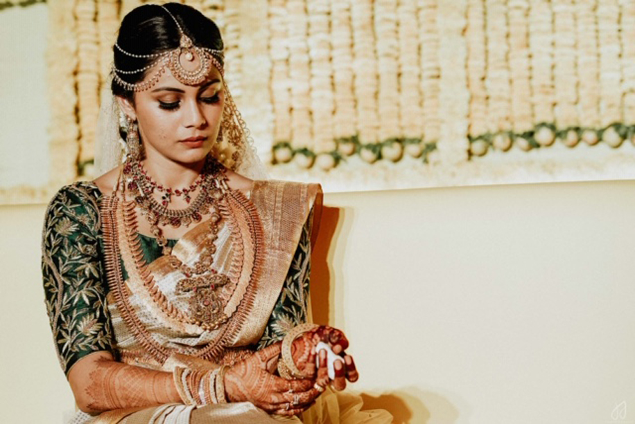 At her pre-mehndi function, Rizwana wore a bandhani half saree but to the temple wedding, the bride showed up totally in tradition. This South Indian bride opted for a Kanchipuram saree with temple jewellery. The outfit, a perfect example of tradition and elegance, was accessorized with statement jewellery including a maang tikka that highlighted the subtle makeup accentuating the bride’s features.