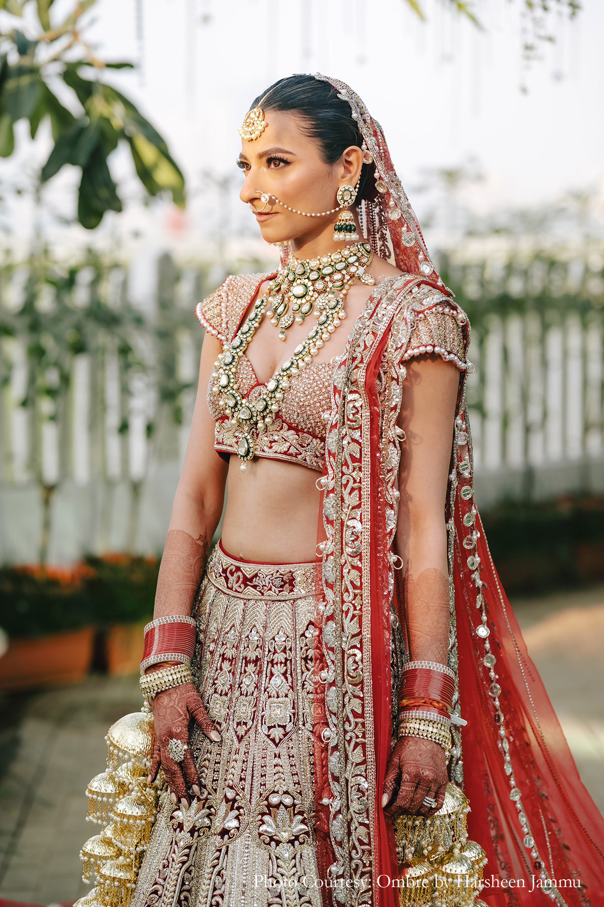 For her big day, Saanya was the quintessential Indian bride wearing a red lehenga embellished with gold threadwork and pearls. The choli with its plunging sweetheart neckline gave her plenty of space to layer kundan and emerald-encrusted necklaces while matching jhumkas dangled from her ears. The winged eyeliner and a nude lip perfectly complemented the look.
