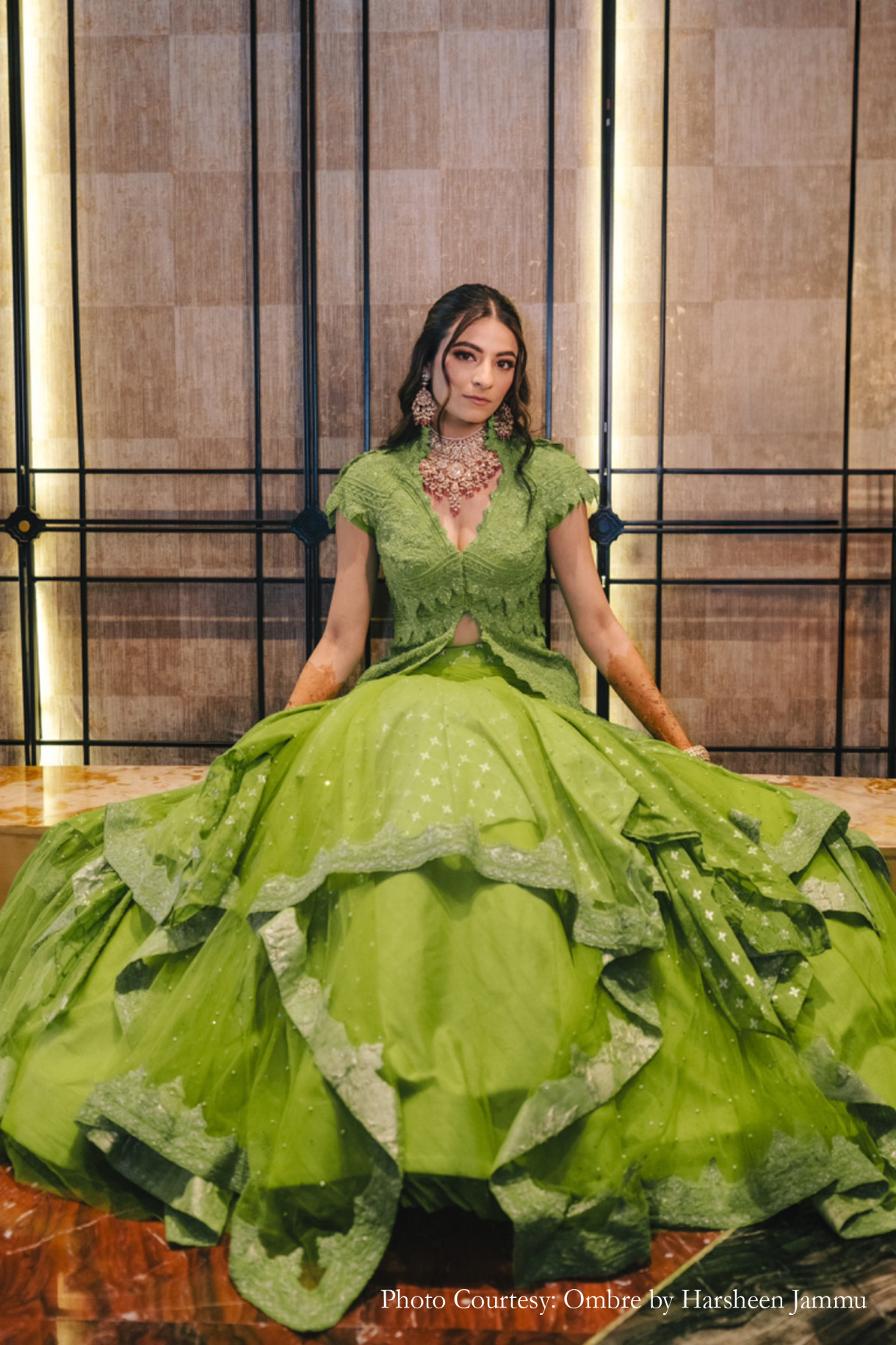 Comfort was the topmost priority with style coming at a close second as Saanya wore this exquisite leaf green lehenga for her floral mehndi. Amidst the sea of vivid blooms, she stood out in each picture with her multilayered lehenga stealing the spotlight along with her unconventional jacket-style choli. Adding a dash of glam to the look was the statement necklace set and the heavy kundan kadas.