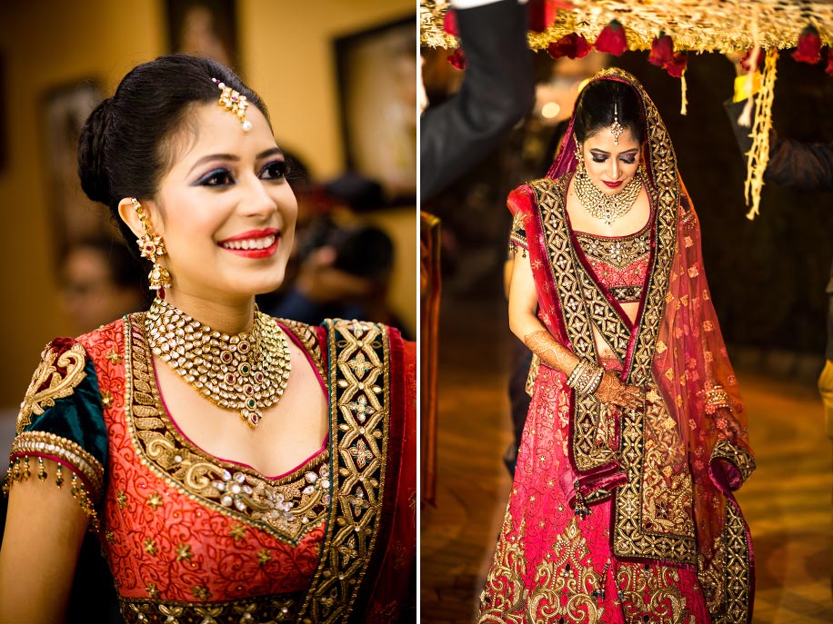 The traditional wedding lehnga was designed by Tarun Tahiliani. My favorite thing about this ensemble was its coral color. My mother wanted me to wear red and I was leaning towards pink, but when we saw this lehnga, we immediately knew it was the ‘one’. I loved its rich and zardosi and resham booti embroidery which was striking but not overwhelming.