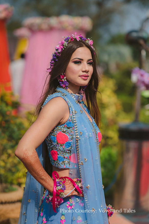 In vibrant shades of periwinkle blue, bubblegum pink, and citrus, Shalini’s lehenga by Papa Don’t Preach by Shubhika was reminiscent of a colorful carnival. Her waist-length open curls crowned with a floral tiara and floral bangles made her look like a spring fairy. Rosy cheeks and soft pink lids were the perfect accompaniment for her fresh, youthful ensemble.