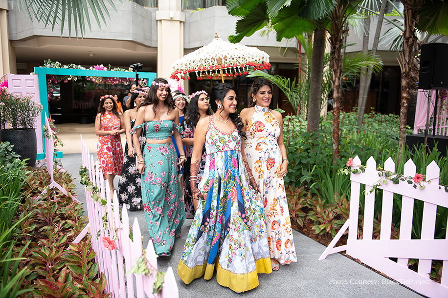 The celebrations kick-started with the mehendi lunch that featured bohemian decor that included a variety of flowers mixed with dream catchers and other elements. Sherina wore a floor-length multicolored floral dress with lemon yellow trimming, which she paired with simple diamond jewellery for a boho but glam look. With her soft messy side braid accented with sprigs of baby’s breath, a fresh face and nude-pink lips, she looked like a festive forest fairy.