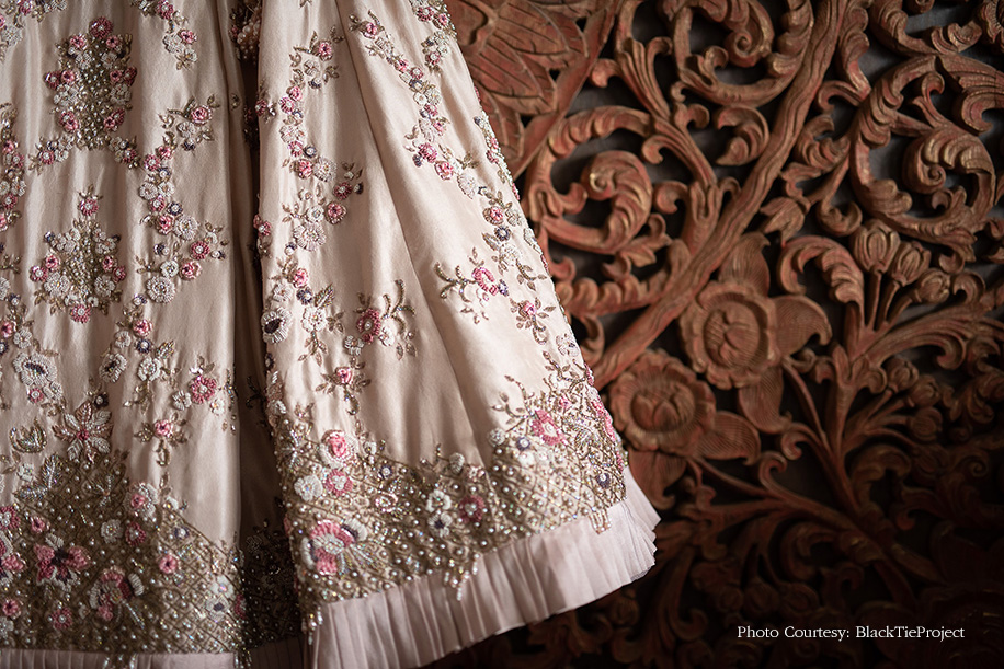 Actress Anushka Sharma‘s dreamy floral and blush pink wedding lehenga set some serious style goals for Sherina. For her outdoor day wedding, she chose a primrose pink lehenga from Christina WT in Shahpur Jat, which featured dainty floral and pearl accents, a pleated hem and crystal tassels on the sleeves. She teamed her outfit with a polki jewellery set with fuchsia crystals that added a pop of colour, and kept her makeup dewy and hair simple. She skipped wearing heavy bangles or the traditional bridal bracelets, and opted only for a diamond tennis bracelet that had simple pearl and gold kaleerein, and her engagement ring.