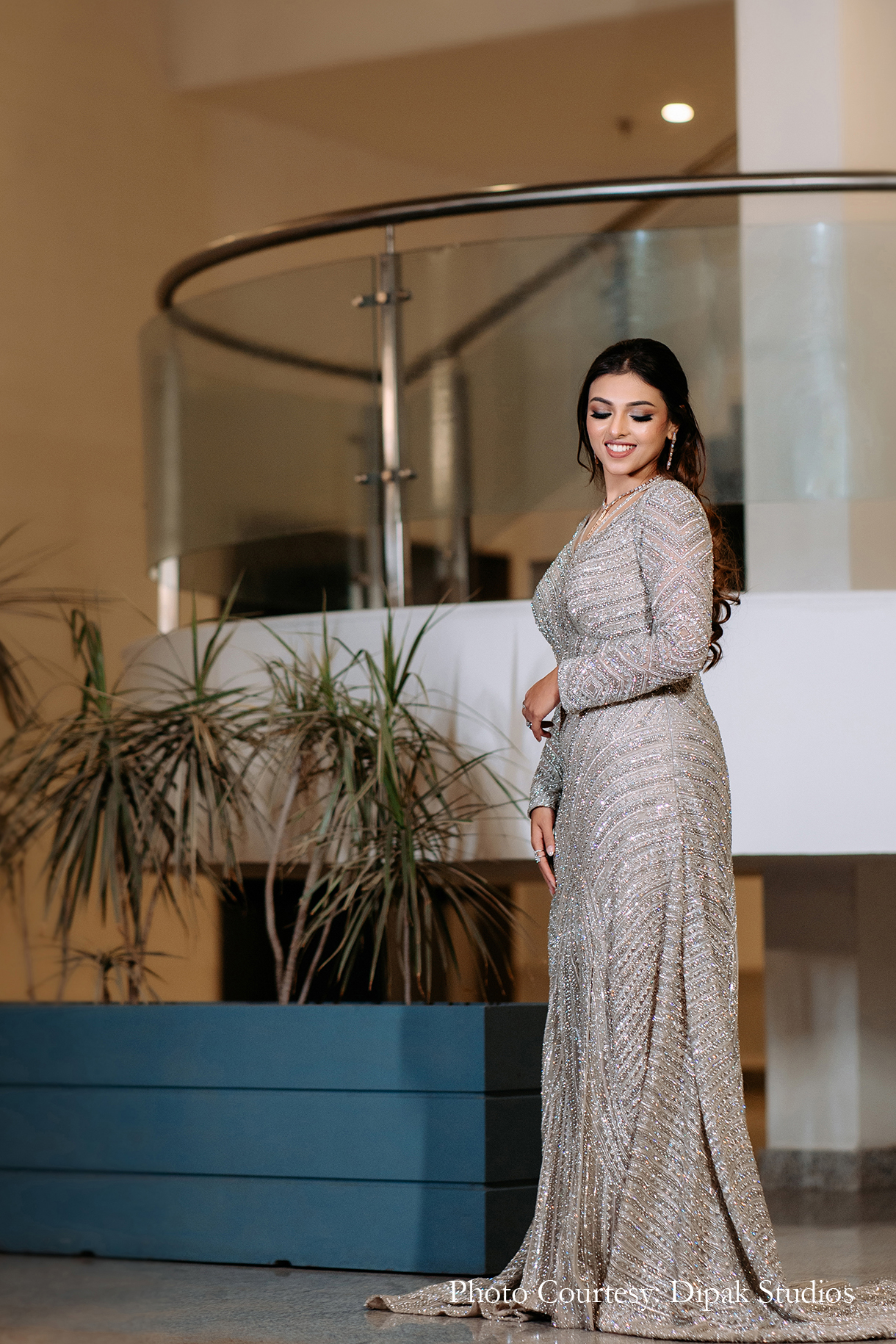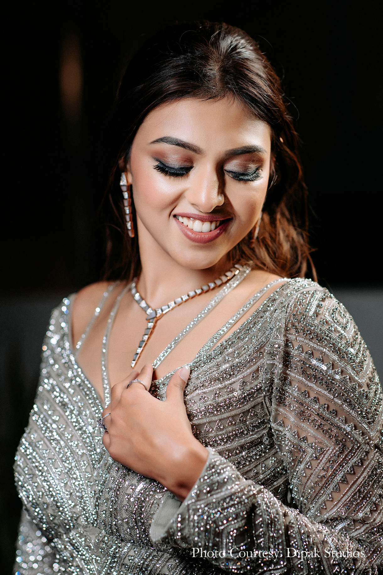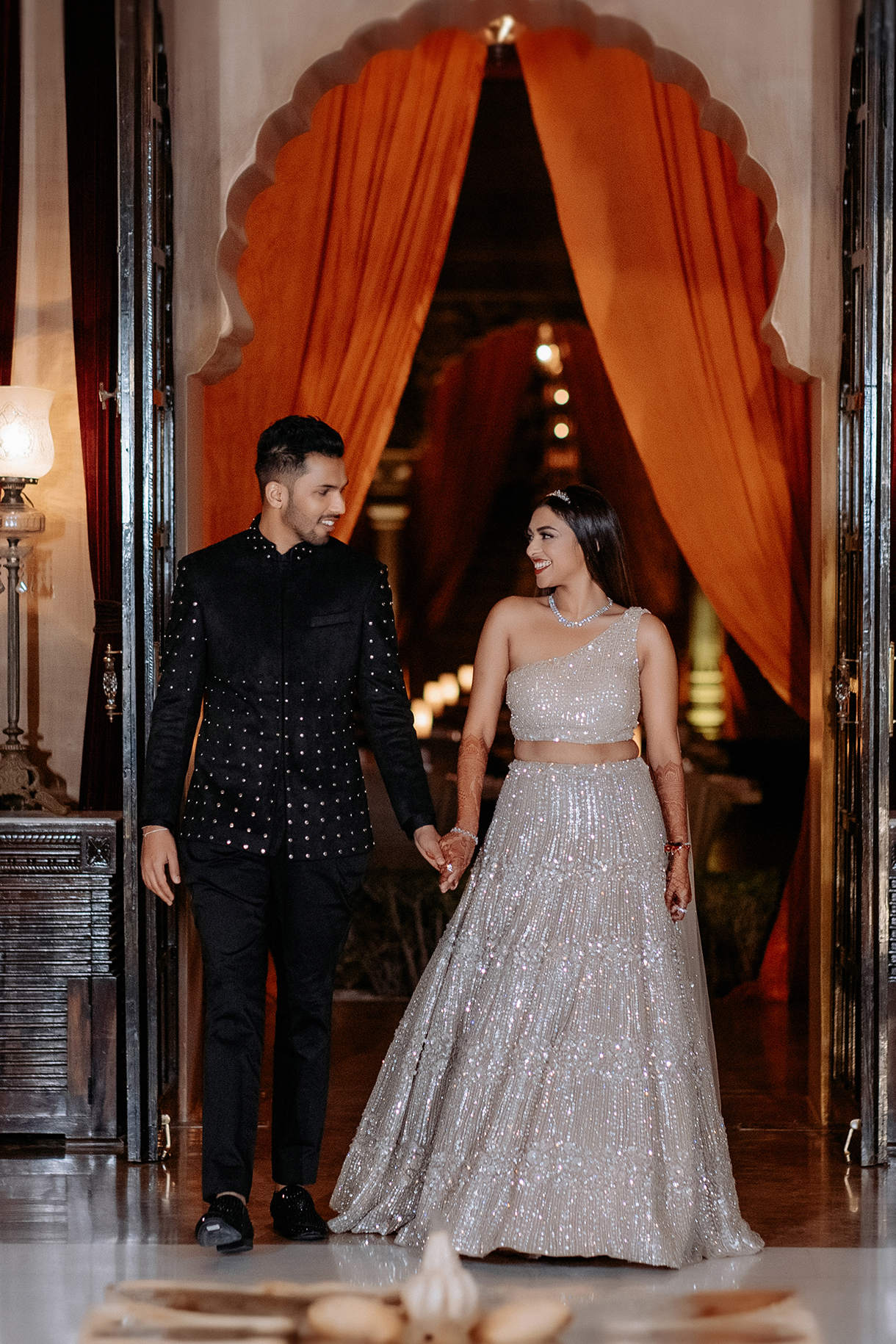 For the engagement evening, glamour took the front seat as Shraddha donned a stunned silver lehenga. With a one-shouldered choli and a sequined silver lehenga that glimmered with her every move. On the accessories front, she kept it simple with minimalistic diamond jewellery that adorned her neck, ears and wrists.