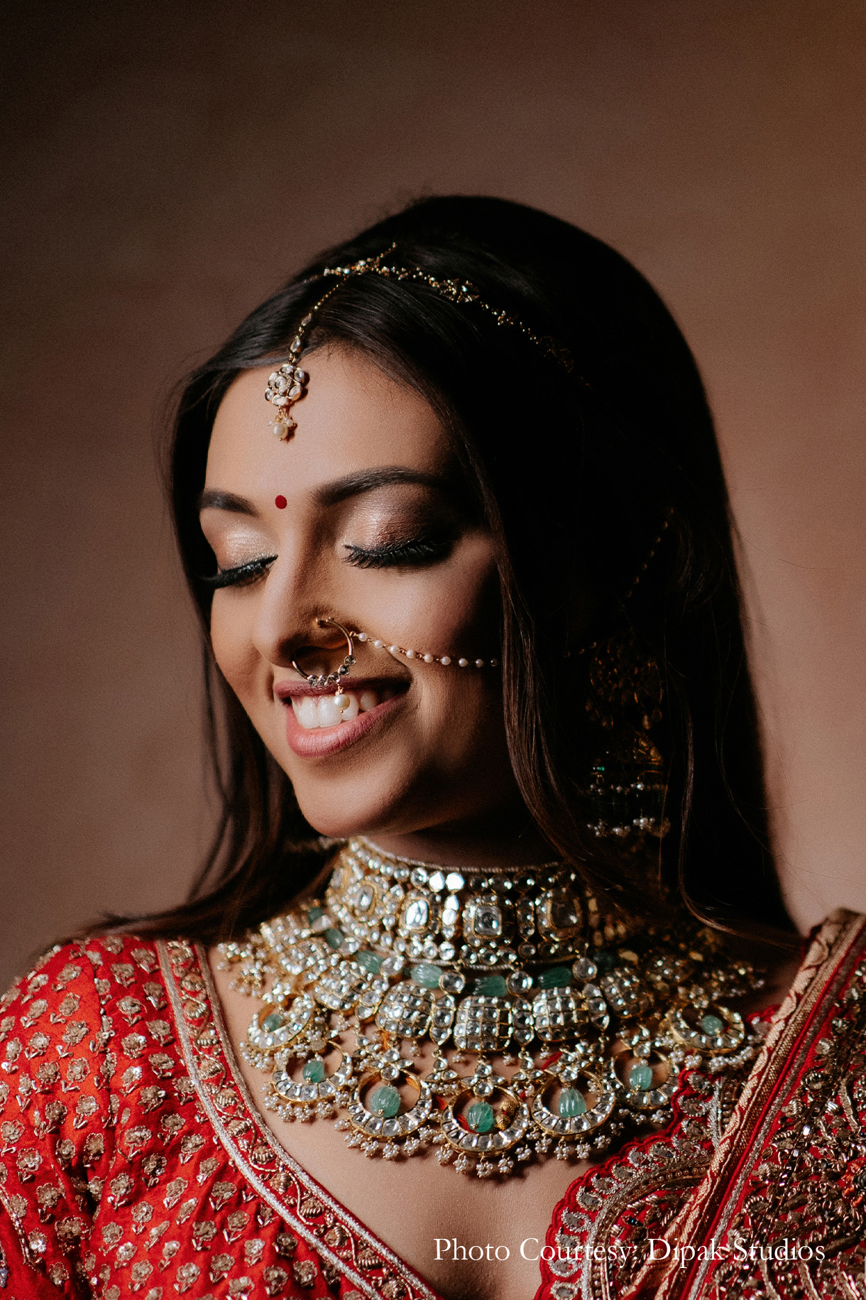 Carefully curating her wedding wardrobe, Shraddha was keen on ensuring that she paid an ode to her roots while expressing her love for sleek modern styles. Owing to this perspective, her wardrobe was a fun mix of innovative materials, like, a structured metallic fabric that was stitched in a traditional lehenga silhouette. Each look was also paired with subtle makeup so that the ensembles spoke for themselves and ensured the bride was comfortable in each one of them.