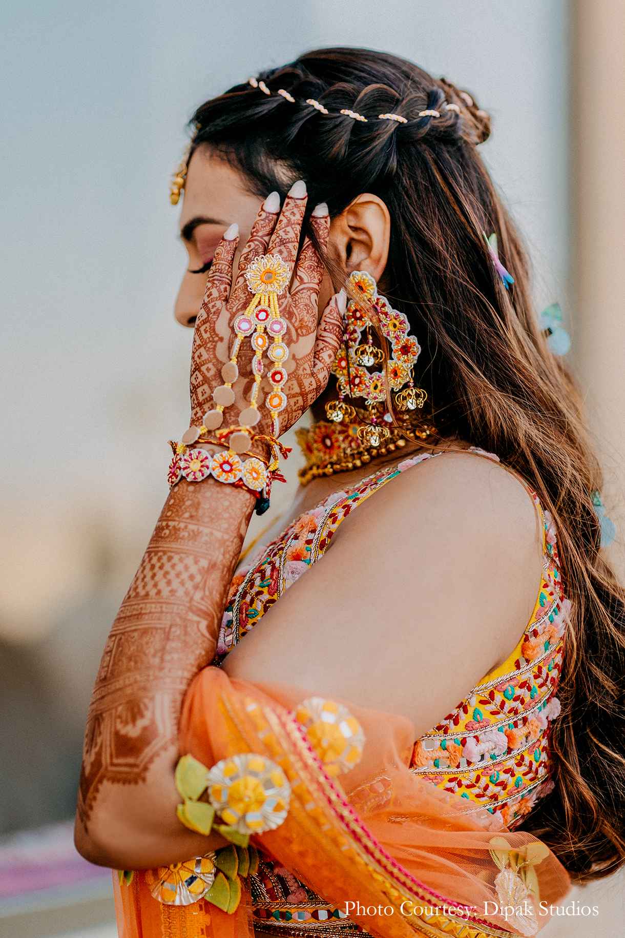 Orange and yellow hues were at the forefront of the haldi celebration. Dazzling under the sunshine, Shraddha wore a patchwork lehenga that flaunted various Indian textile crafts like banarasi zari work, jacquard patterns, mirror work and embroidery. The choli was also a yellow-hued one with intricate threadwork. Accessorizing this look was a pair of statement chaandbalis, a choker necklace and a pair of floral haath phool.