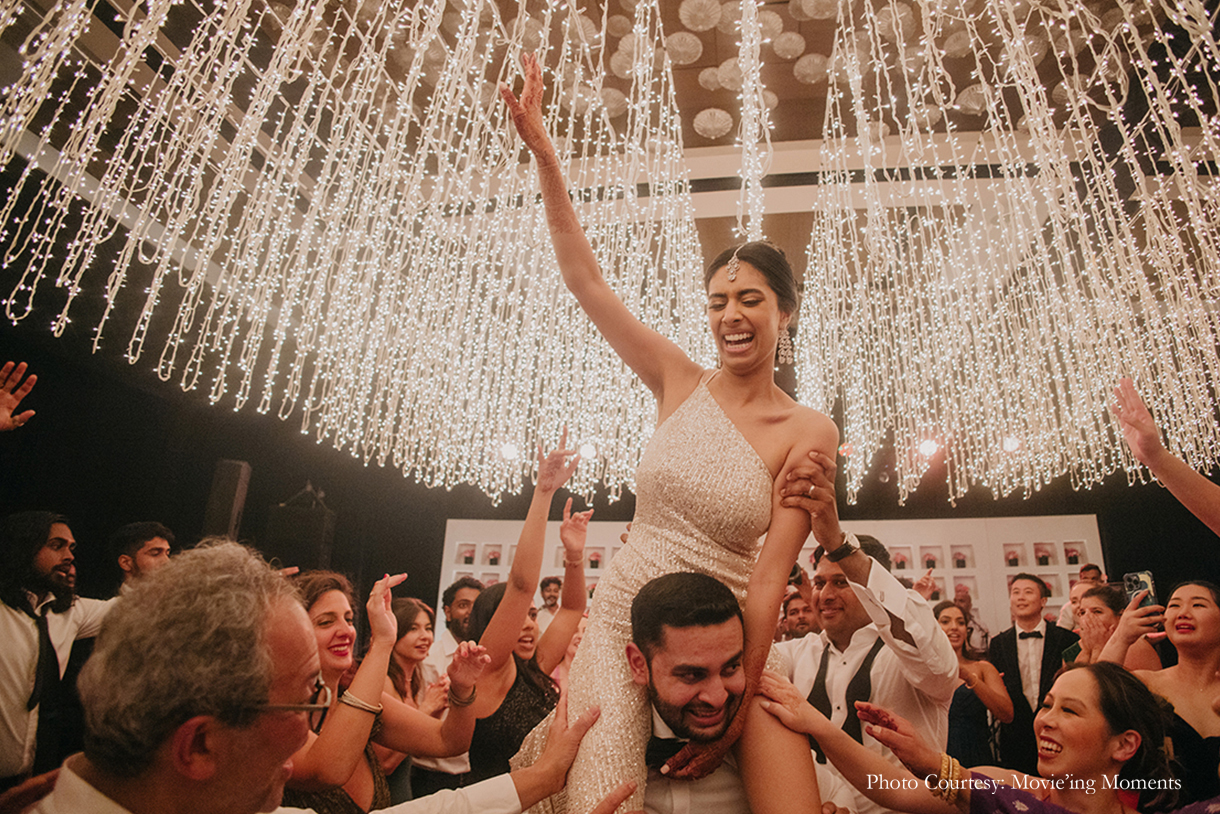 For the grand reception, Soniya embraced classic sophistication in a Seema Gujral lehenga. Her search for the perfect outfit ended when she discovered a dazzling long-sleeved, pink-toned glittery lehenga at Pernia’s Pop-Up Shop in Mumbai. Under twinkling fairy lights, she took to the monogrammed dance floor, her elegant waltz marking the perfect finale to an unforgettable wedding celebration.