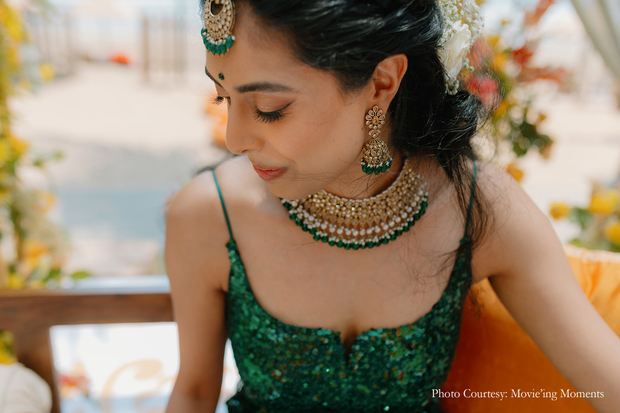 For her mehendi ceremony, Soniya opted for a modern aesthetic, stepping away from traditional attire. She stunned in a sleek, sequinned bottle-green gown, striking the perfect balance between elegance and ease. The bold choice not only honored the traditional green hues of the ceremony but also allowed her to move freely and enjoy every moment of the celebration.