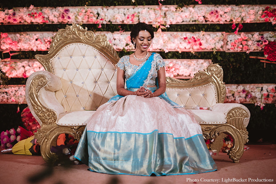 “After exhausting so many great options for my previous functions, I was a little clueless about my reception look. My stylist suggested I buy a saree with a silver zari combination. I was lucky to find one with a sky blue combination, which I later tailored into a lehenga. To match the skirt, I got a customized pastel blue blouse with thread work embellished with zircons. And added a blue dupatta. A blue dupatta and a belt with kundan work and pearl studs brought the entire look together. I accessorized my look with a pearl set. My makeup was flawlessly done with an airgun – a hint of color on my lips and eyes kept it youthful and fresh. I got my hair tied into a flower-shaped updo and got shiny white pearls added to it.”