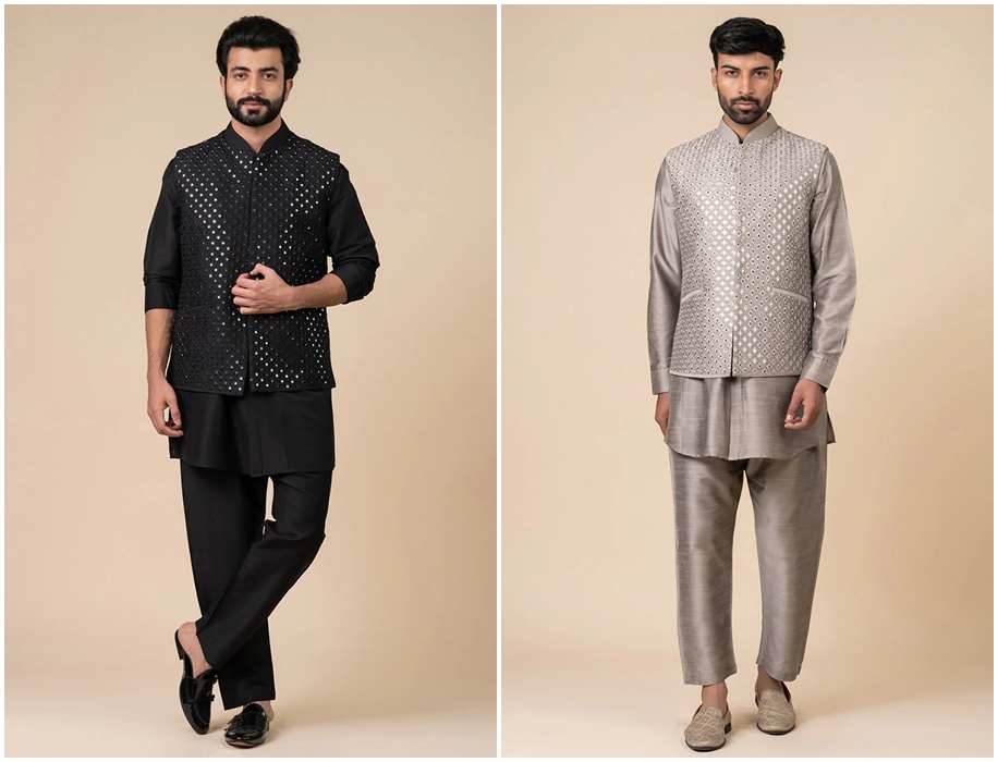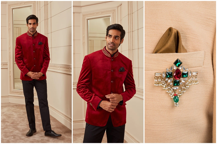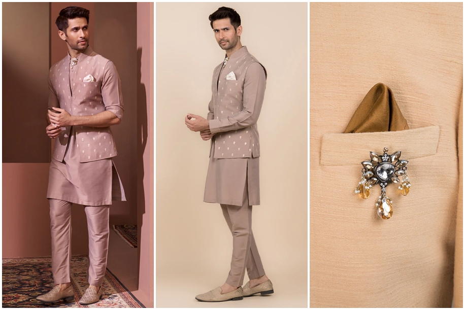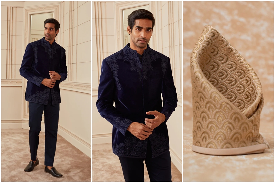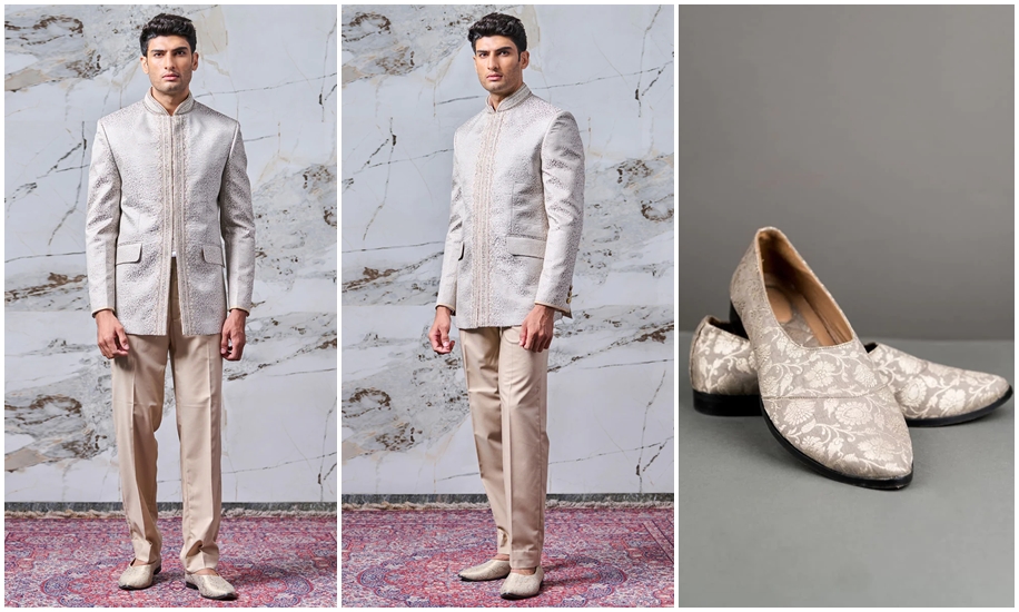 Be it a formal dinner or cocktail hour, put forth your glamorous best in a chic Bandhgala set as you step out as a newlywed! Featuring the most exquisite zari and zardozi work, these rich velvet jackets by Tasva exude muted decadence, while this striking silver option in silk brocade ticks all the boxes for that classical aesthetic! Complete your look with matching shoes, and jazz it up with a brooch or pocket square.