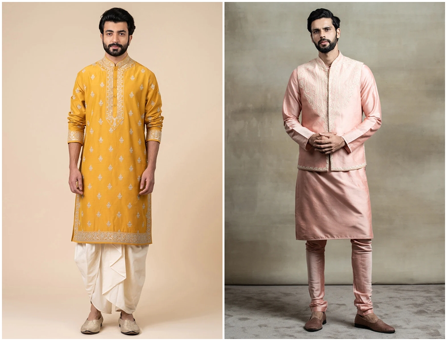 A vibrant celebration like Haldi demands the youthful exuberance of summer hues! Opt for this sophisticated ensemble with delicate embroidery in a pale pink palette for an elegant brunch, or keep it traditional with a striking ochre embroidered kurta and dhoti set.