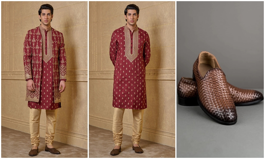 Get ready to set the stage ablaze for your Sangeet evening! Embrace the rustic opulence of this rust-red sherwani with golden detailing or the minimalistic elegance of these mirror-work silk kurta sets. For a true statement look, go all out with interesting details like panels or asymmetric silhouettes. Woven or patent leather shoes are the perfect accompaniment with ensembles of most hues.