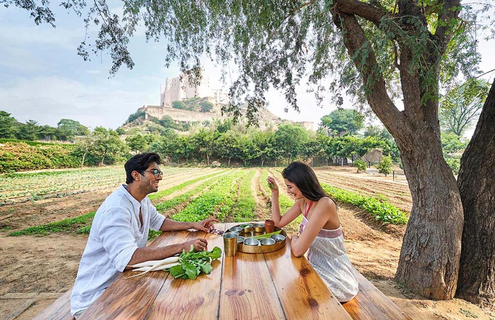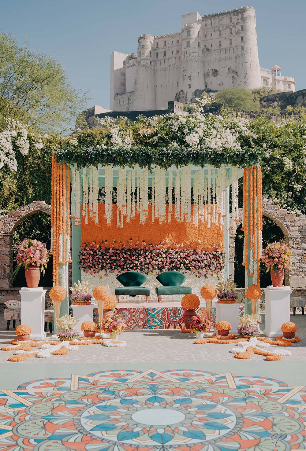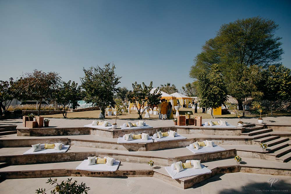 Unique wedding experiences like helicopter rides and hot air balloon rides ensure the romance is at its peak before the wedding while a boisterous baraat with the groom on a vintage car ensures plenty of picture-perfect moments right before the wedding. And, if keeping your guests entertained is at the top of your to-do list, then, Alila Fort Bishangarh also orchestrates folk performances where delicious local cuisine is cooked over a wood fire and a pit is served along with a night under the stars where one can gaze at the sky for hours!