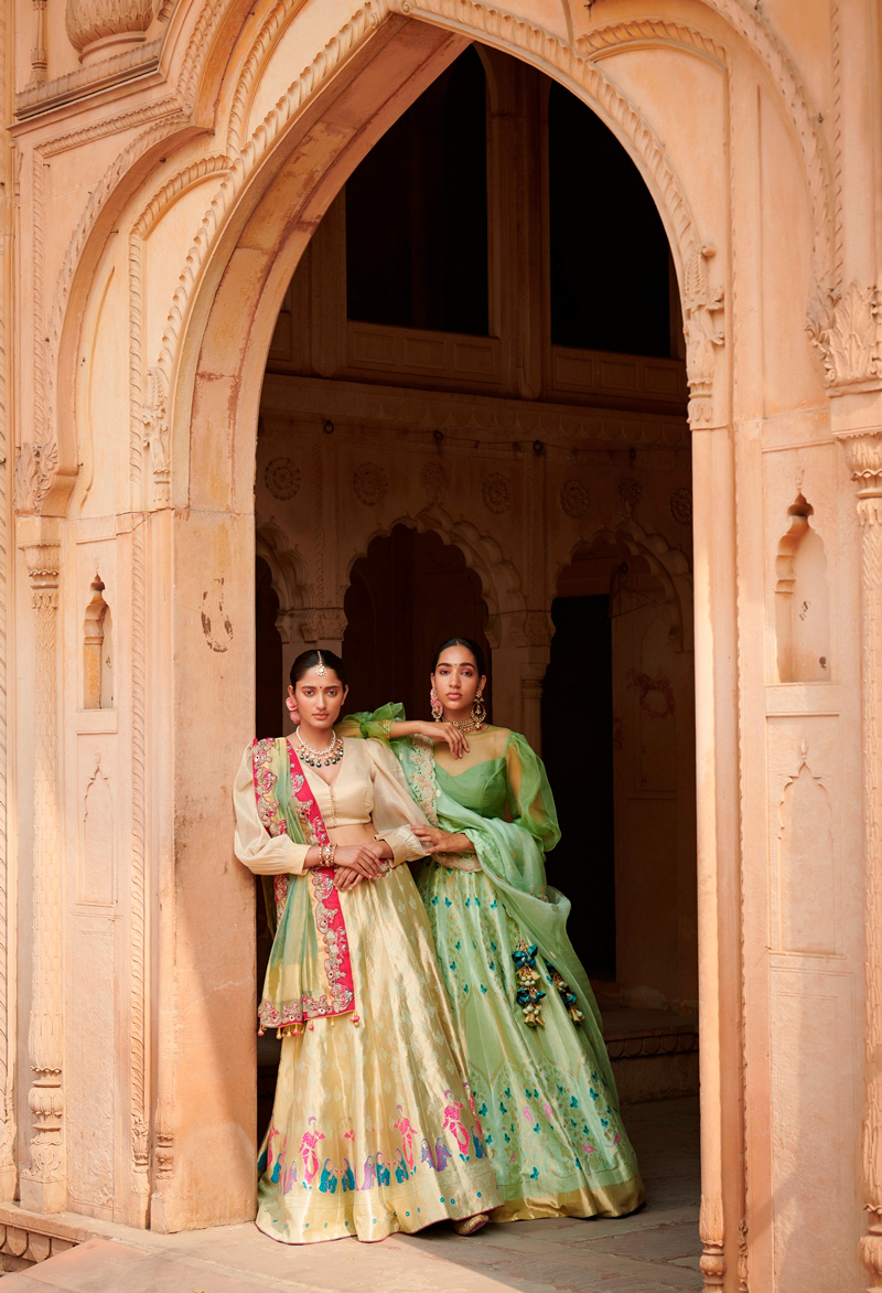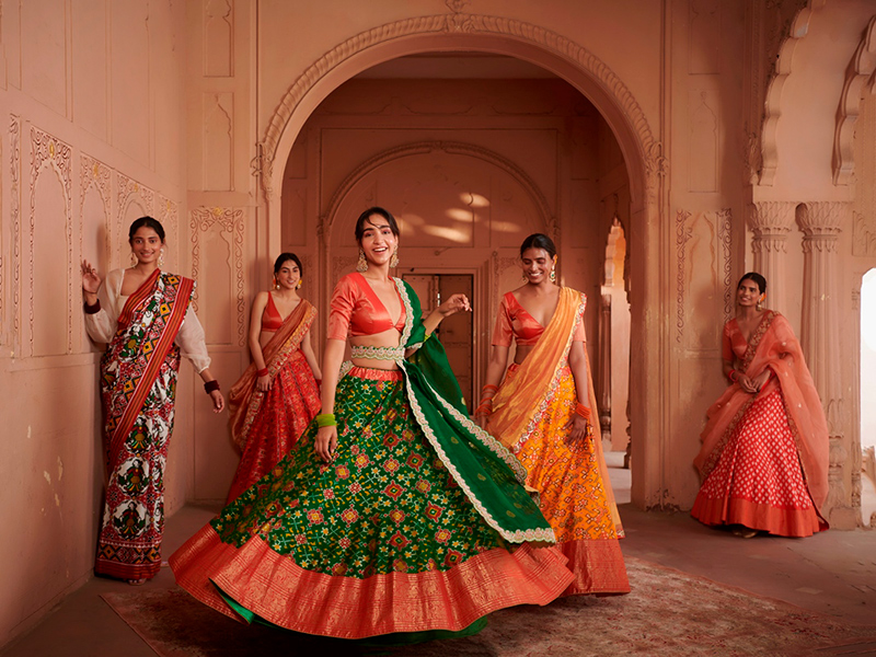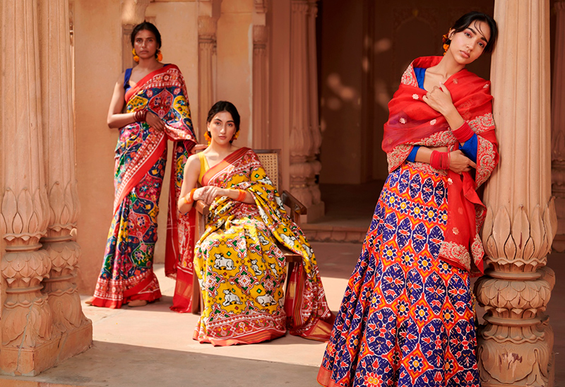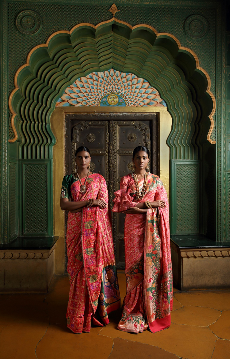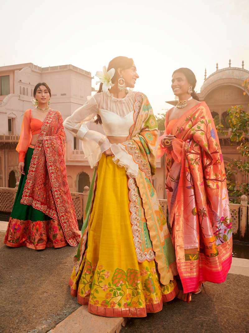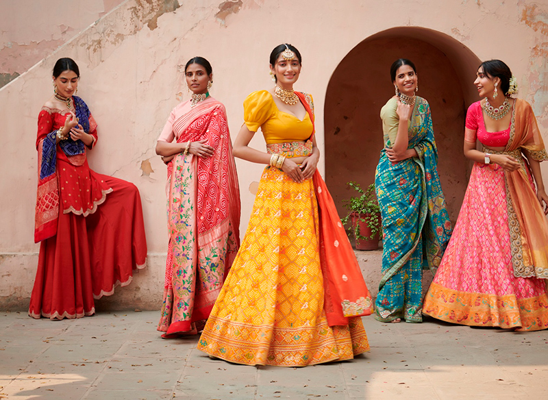 The brand works with a plethora of different arts from across the country, including Banarasi, Paithani, Kanjeevaram, Uppada, Jamdani, Patola, Bandhani, and Chikankari, as well as with intricate embroidery work with zardozi, pearls, and more.