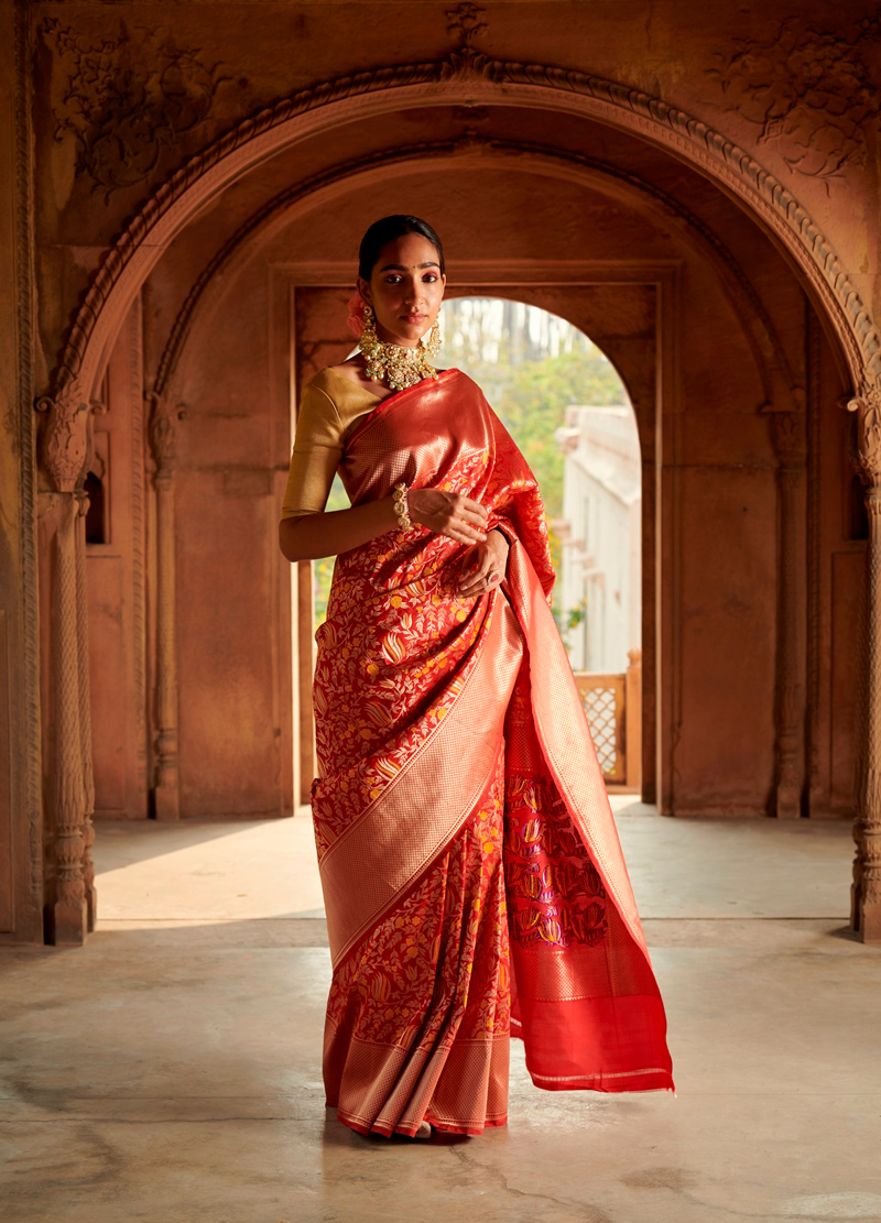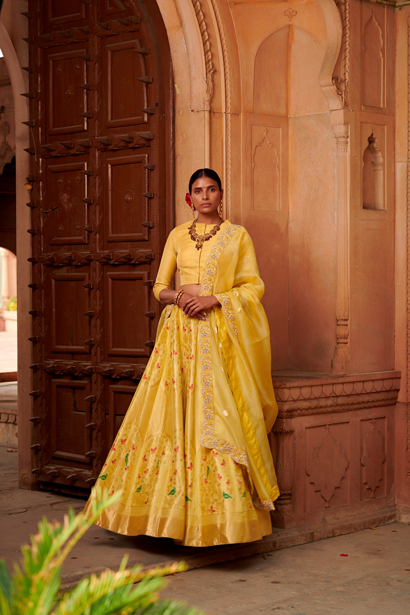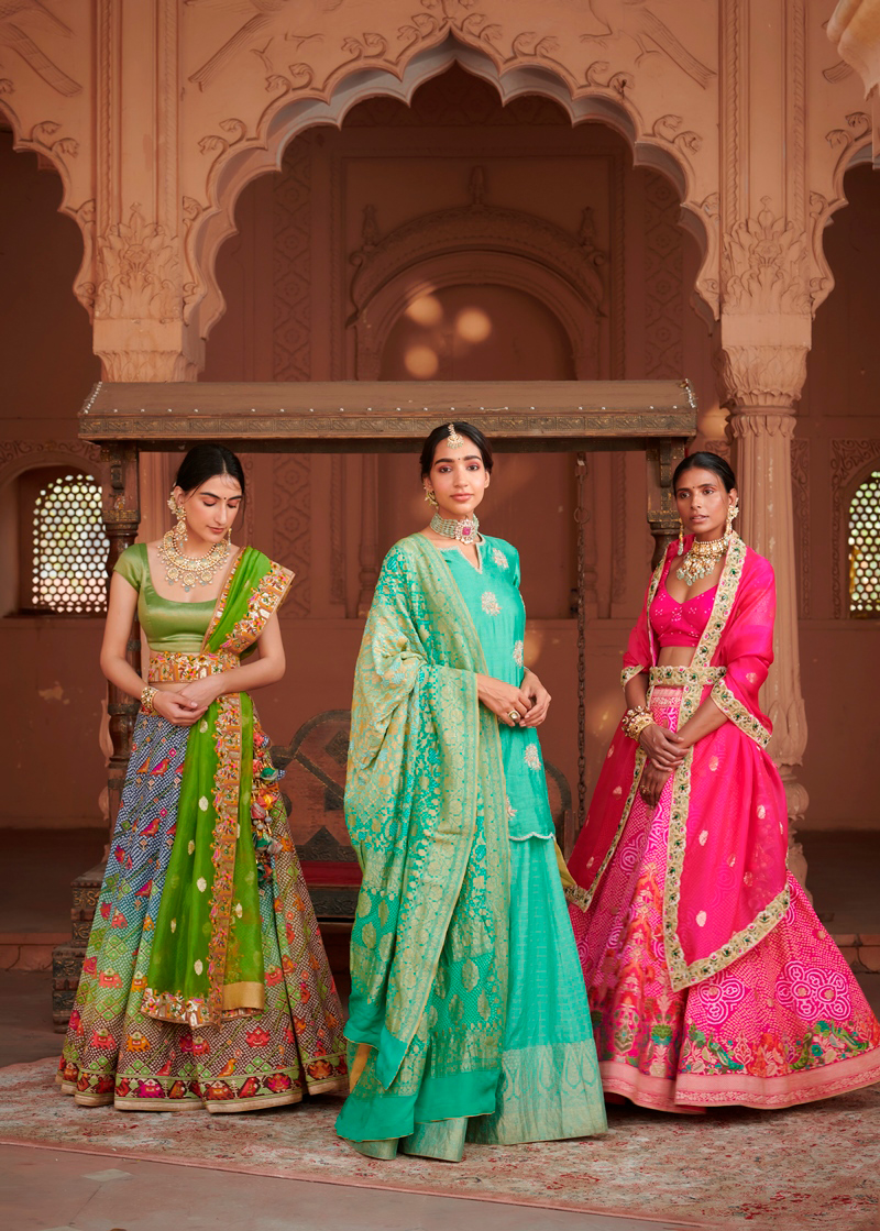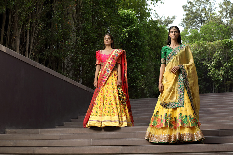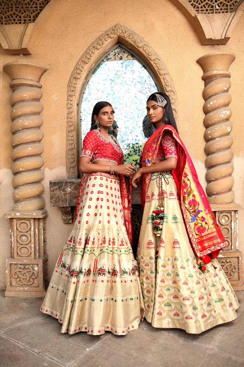 The brand works with a plethora of different arts from across the country, including Banarasi, Paithani, Kanjeevaram, Uppada, Jamdani, Patola, Bandhani, and Chikankari, as well as with intricate embroidery work with zardozi, pearls, and more.