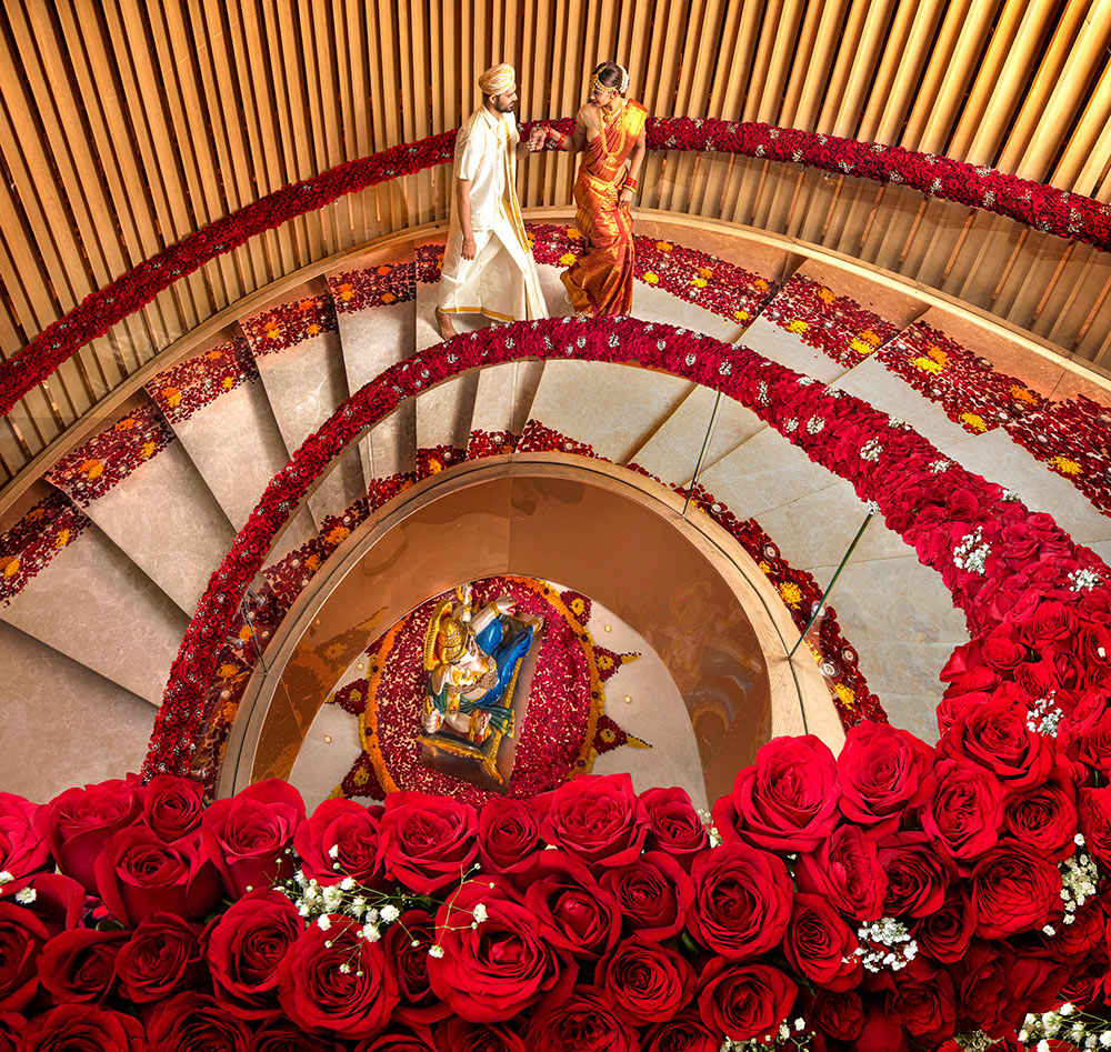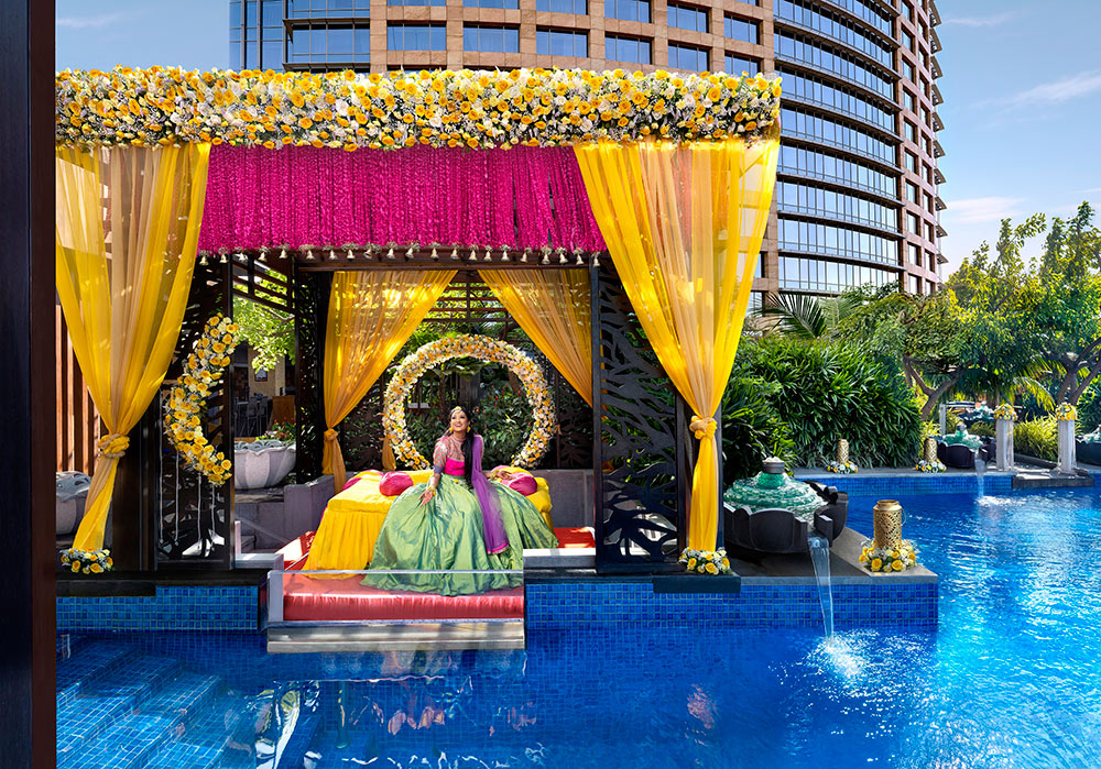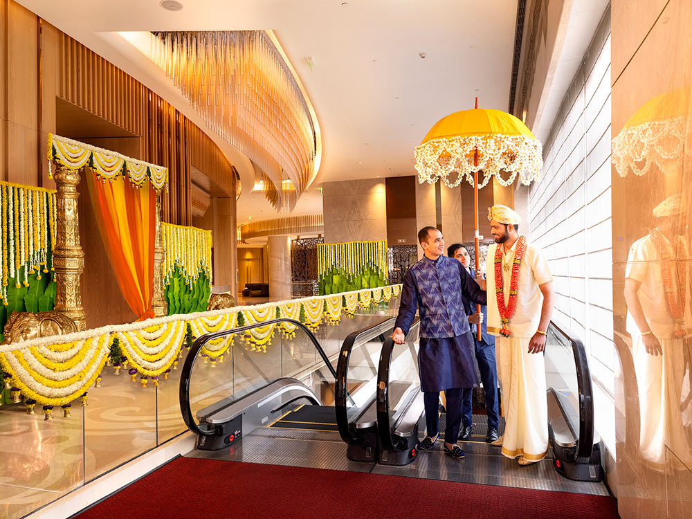 Offering stunning views of Ulsoor Lake and conveniently located in the heart of Bengaluru, Conrad Bengaluru is an hour away from Bengaluru international airport. With 285 guest rooms and more than 2400 square meters of total event spaces, this modern hotel is an ideal canvas for your wedding. Furnished with both big and small ballrooms that come with their own private foyers from where you can feast your eyes on the serene Ulsoor Lake, this property offers a unique backdrop to each one of your wedding events. While their largest pillar-free Grand Ballroom can accommodate up to 1200 guests is ideal for a grand wedding, their smaller ballrooms with its capacity of 120 guests are perfect for smaller pre-wedding celebrations, like, haldi or an intimate cocktail party. Conrad Bengaluru has on-board a team of experts who can specifically curates the menu they way you want it to be. The property also caters to a separate kitchen for any vegetarian based meals. Specialising in Marwari, Jain, Gujarati and Rajasthani cuisines, the in-house Maharaj has an array to offer in terms of ingredients, recipes and flavour. With respect to various spaces for various events and ceremonies – the property has a dedicated room for a Nikah ceremony as well as a ballroom for a huge gathering or event. Certified ISO 22000:2018 for Food Safety Management System, the property ensures complete hygiene and safety.