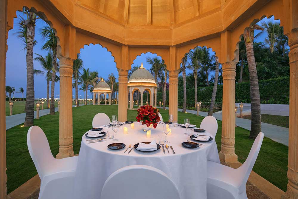 Located approximately an hour away from the Chennai International Airport and overlooking the Bay of Bengal, Kaldan Samudhra Palace takes your breath away from the moment you step into it. Sprawling across 10 acres of manicured lawns with 106 luxurious rooms, suites and sea-facing villas, this beachside palace hotel makes your union an unforgettable occasion with its sheer majesty and in-house venues. Crafted with intricate Rajasthani architecture, your destination wedding dreams can easily come true over here as the property consists of the vast ‘Sagar Pool’ and seaside lawns where your wedding mandap can be backed by the sea waves. The 55,000 sq.ft. Sundarabagh Lawn by the sea is perfect for a sundowner wedding while the pillarless Royal Durbara ballroom spans 10,800 sq. ft. – ideal for a revelry-filled sangeet. On the other hand, the Palace Hi-Tea makes a cosy spot for a starlit cocktail celebration while their in-house restaurants like Palace Bar Somapuraa and Dhani can host a cheery wedding brunch. Indian weddings score high on hospitality and knowing this, Kaldan Samudhra Palace offers the unrivalled flavour of Royal Rajasthani hospitality. From a traditional Rajasthani welcome for your wedding guests to quaint folk performances that leave everyone tapping their feet, this venue aces in the entertainment department.