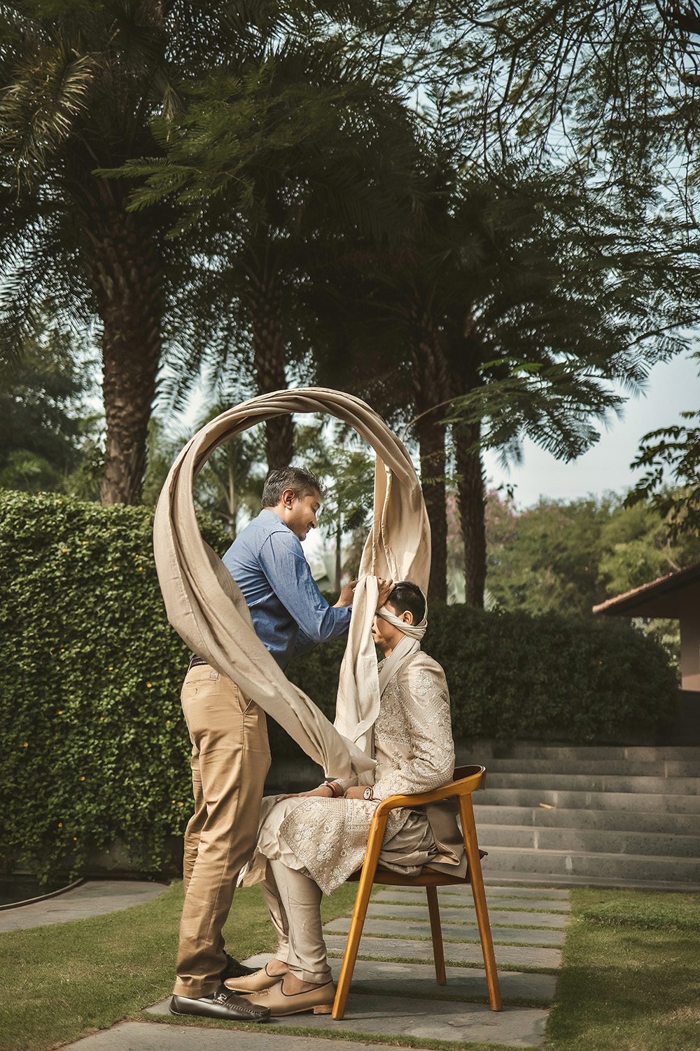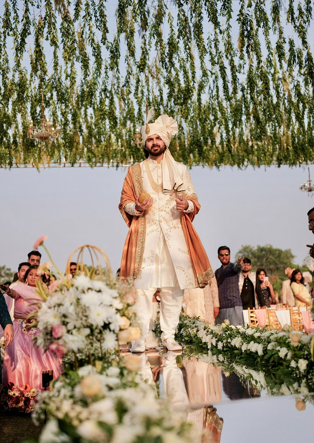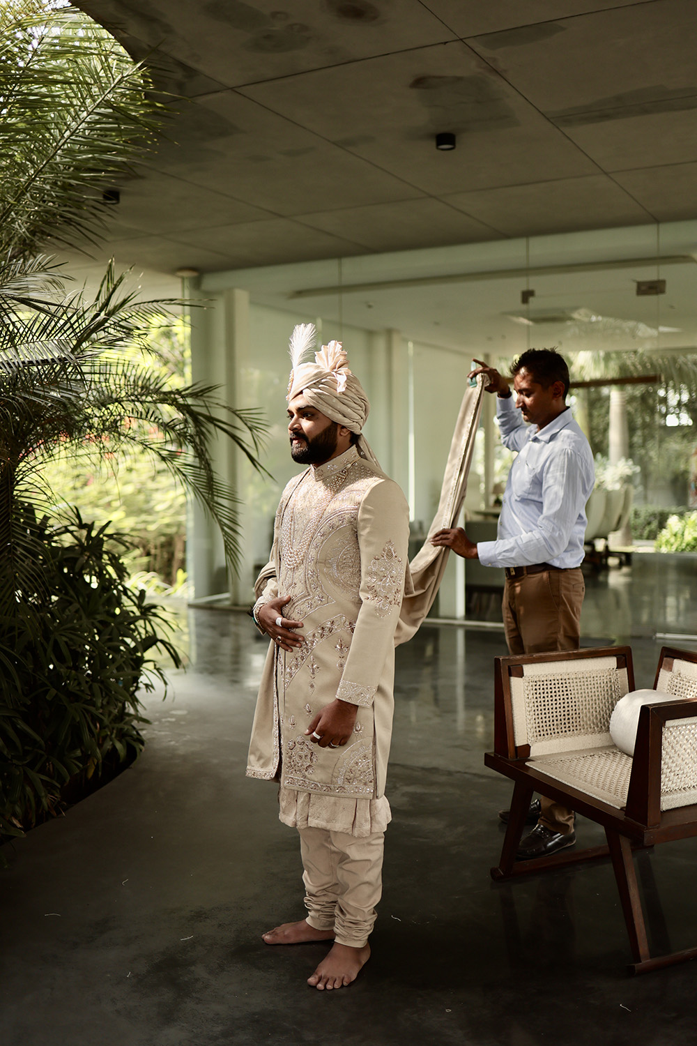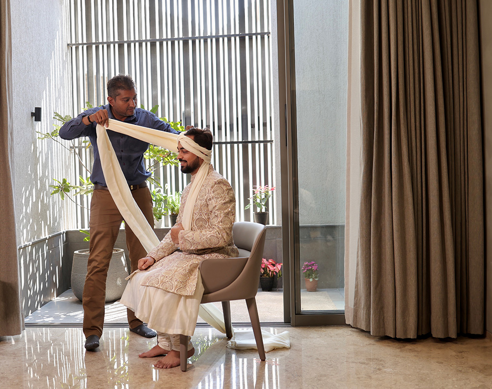 Groom stylists have emerged in popularity as fashion-forward Indian grooms have become discerning in their wedding wardrobe choices. With years of experience in the styling industry, Mantra Kishore – The Groom Stylist, possesses an extensive knowledge of Indian groomwear styling and guarantees impeccable results every time. Their expertise includes – safa draping, shawl styling, outfit coordination and accessories suggestions, like kalgi, brooches, malas, juttis, garlands and bouquets that elevate the entire look.