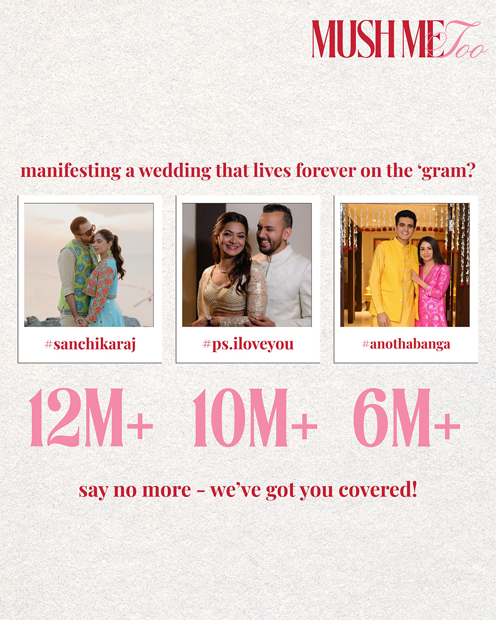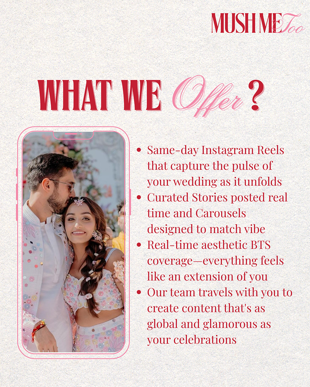 Mush Me Too is a boutique social media agency that transforms weddings into beautifully curated digital stories. Founded by Smriti Agarwal during the lockdown, the agency began with digital gifting and quickly evolved into becoming the first team in India to offer real-time luxury wedding content creation.