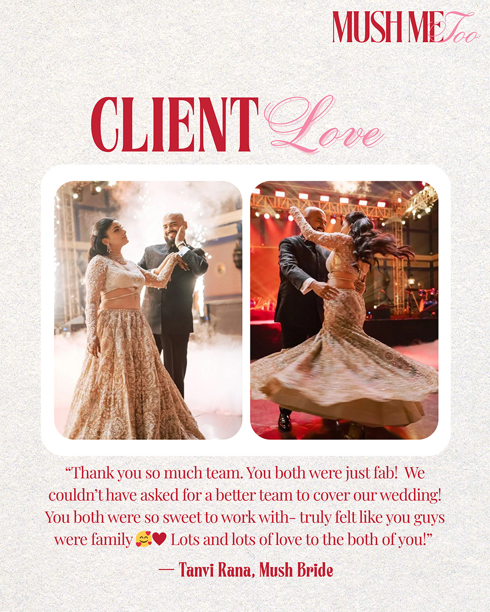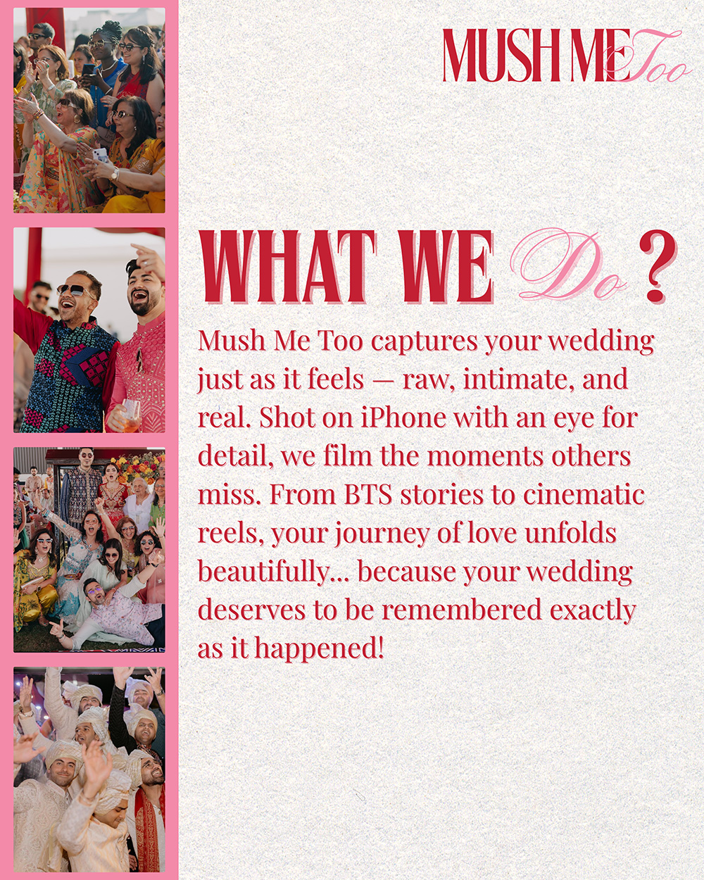 With weddings shot across India and beyond—from Delhi palaces to Dubai—Mush Me Too has carved out a space for digital storytelling that’s fresh, fast, and full of feeling. Over 12 million views later, their couples still say the same thing: “You made us feel like the main character.”