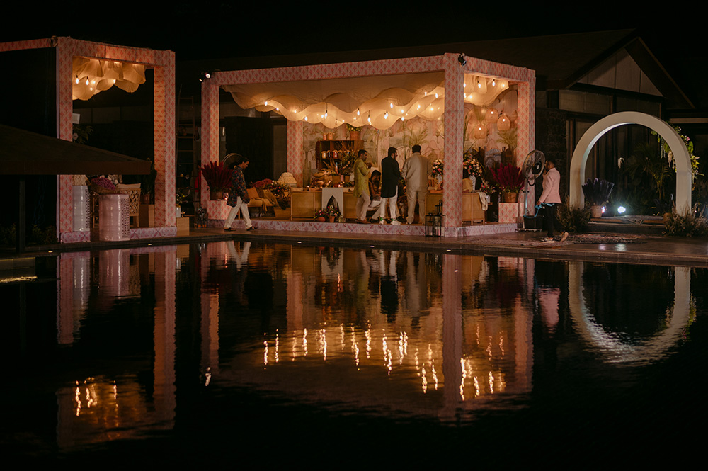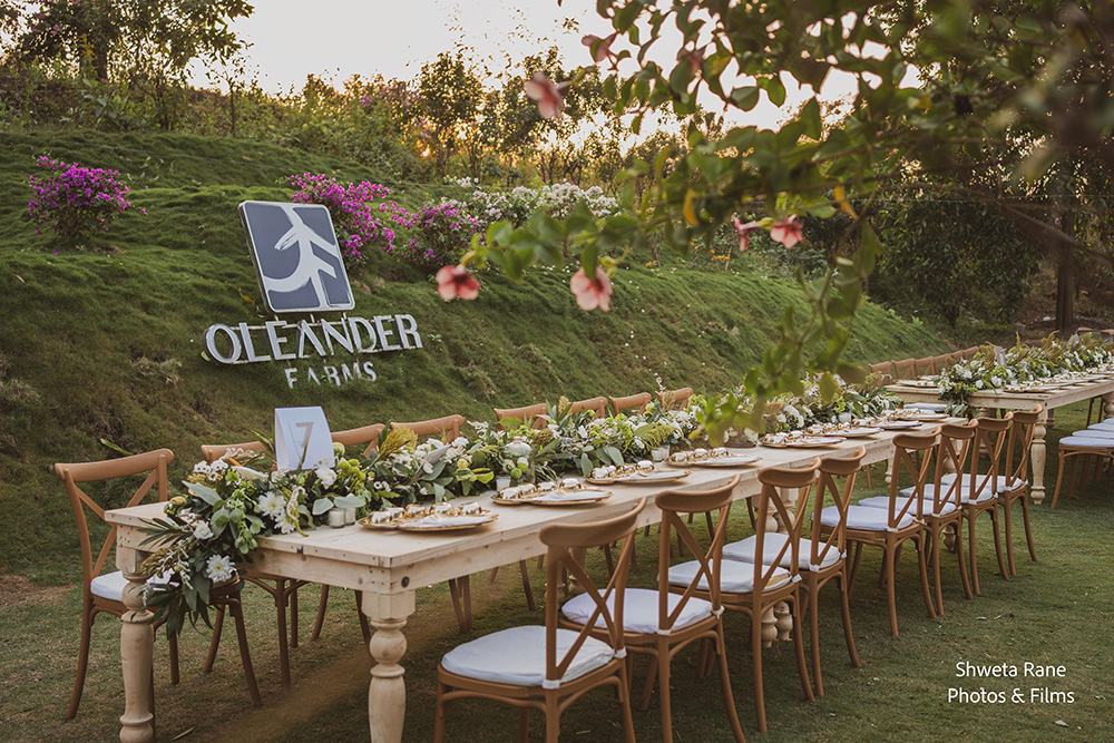 The options don’t end here, as a selection of small yet stunning venues offer diverse backdrops for private parties, cozy pre-wedding celebrations, and family gatherings. Explore the aesthetic infinity pool for a sunkissed Haldi, and the Small Lawn for a vibrant Mehndi. The Ballroom is perfect for hosting breakfast or lunch for your wedding guests, while memorable Afterparties can come alive at the Common House. Elegant indoor spaces like The Living Room and The Den promise chic celebrations for family events like the Bride’s Mehndi or intimate dinners. Complete with in-house catering, event coordinator, transport services, and more, Oleander Farms is the perfect escape from the bustle of the city for a personalized wedding getaway experience!