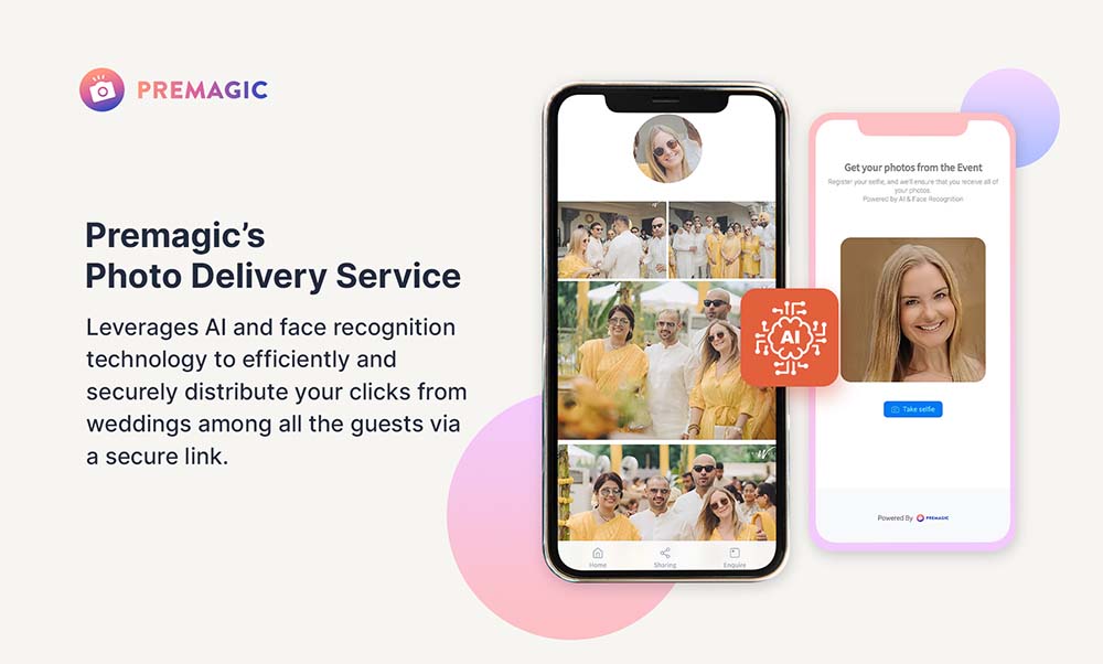 Premagic’s Photo Delivery Service AI and face recognition technology to efficiently and securely distribute your clicks from weddings among all the guests via a secure link.