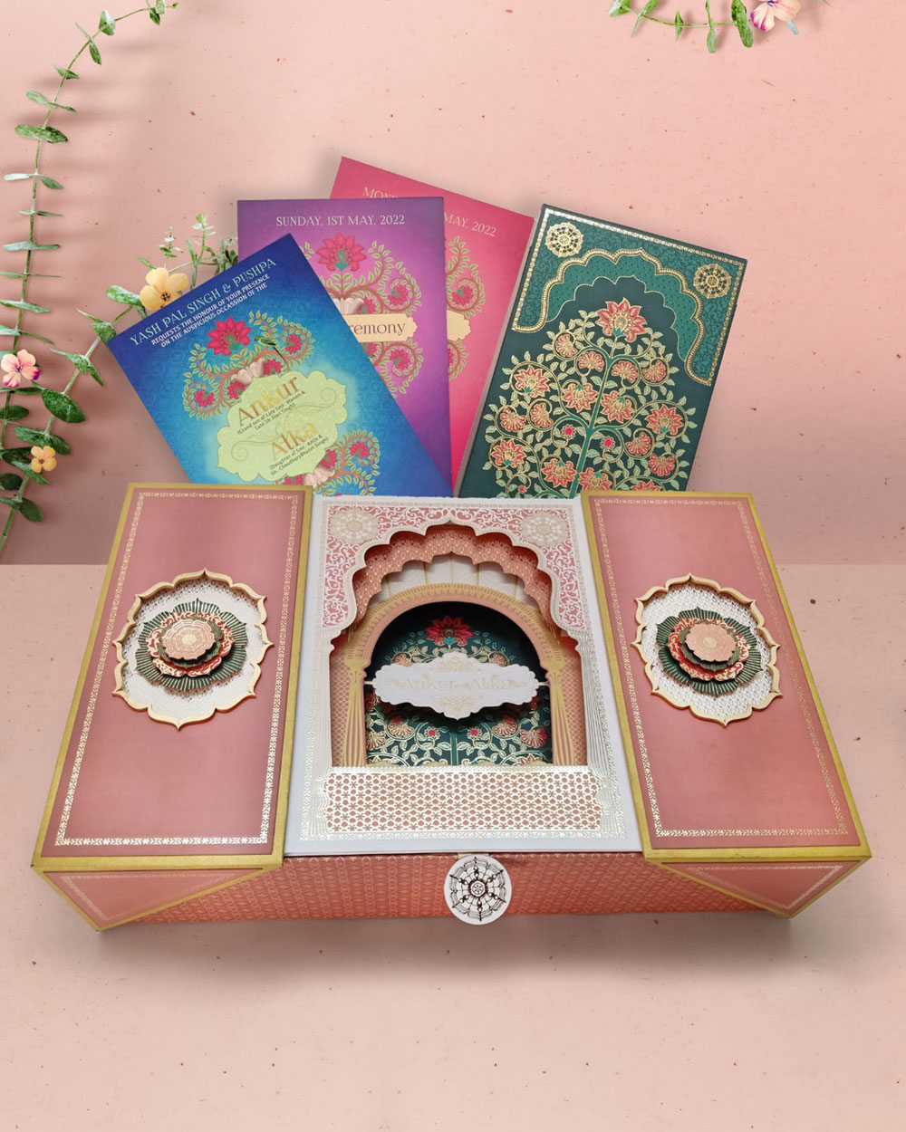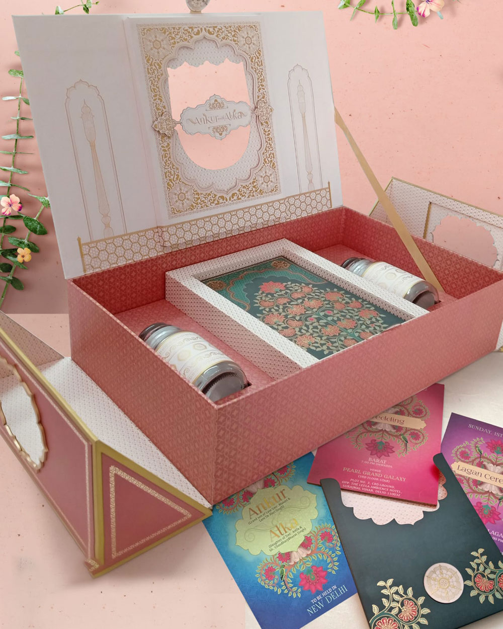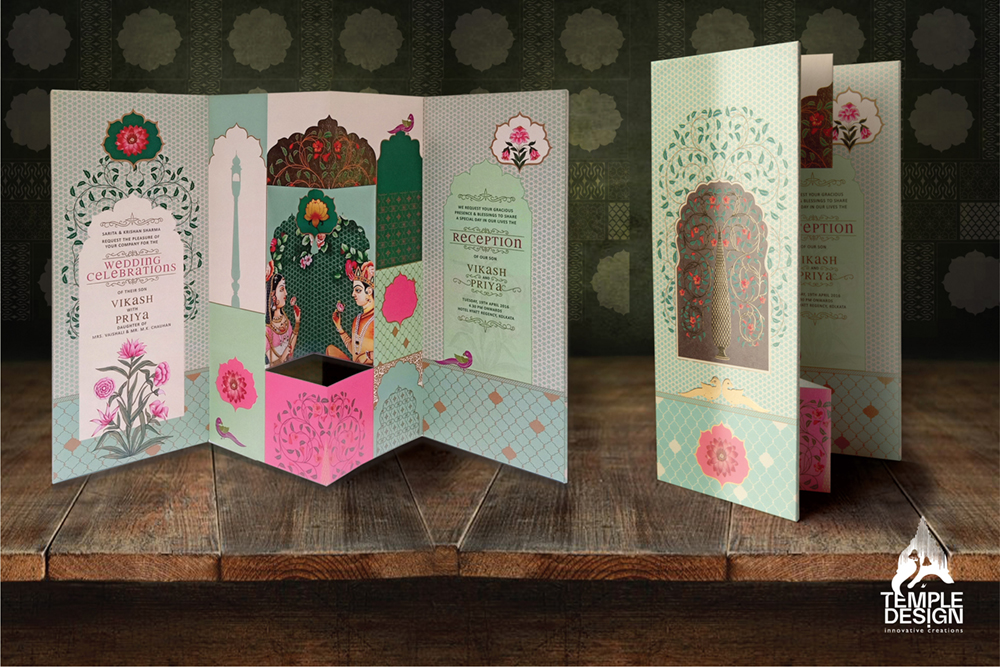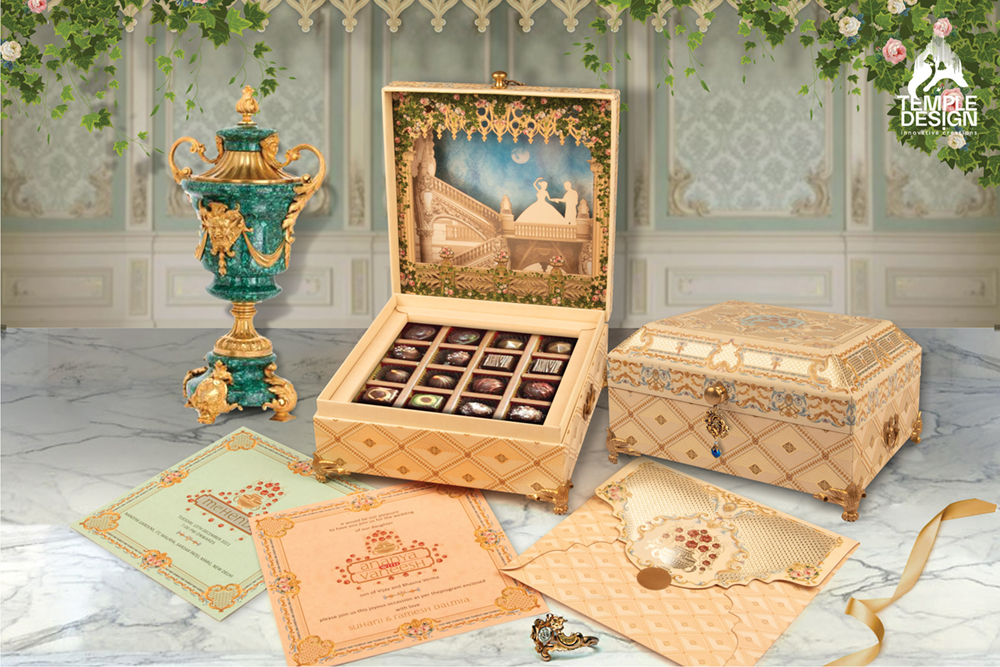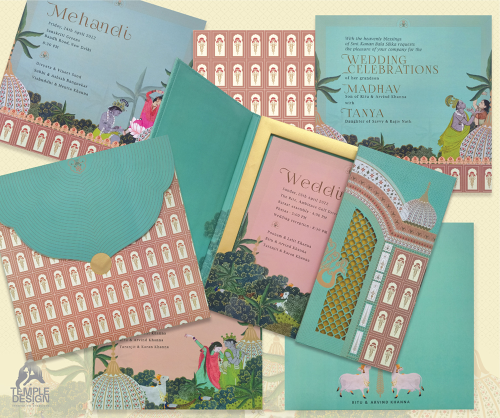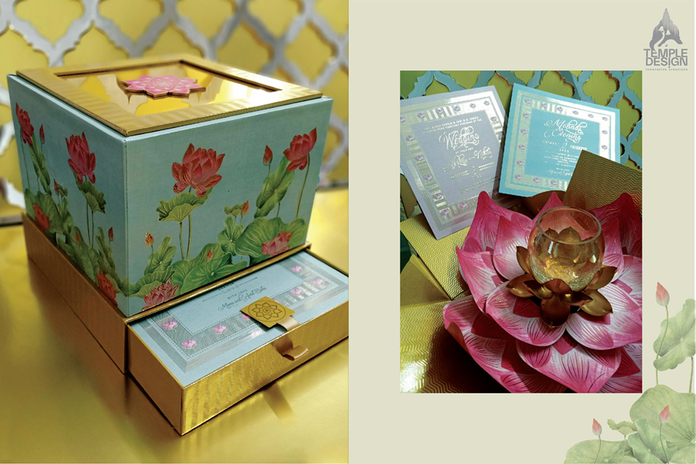 Temple Designs is a Delhi-based wedding invitation design company known for its focus on the finer nuances of luxury and art to create inspiring invitation cards using unusual production techniques. Blending technology with creativity, they design cards that express your wedding style and give your guests a taste of your unique celebration with exquisite personalized details.