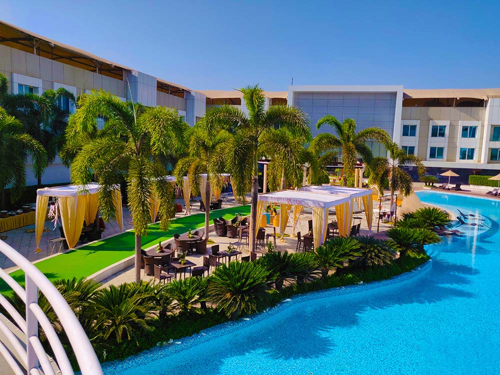 The Deltin, Daman is a five-star deluxe property and the largest integrated resort spread over 10 acres, with 3,00,000 sq. ft. of developed area. The first and only five-star hotel in Daman, this property is a three-hour drive away from Mumbai and Surat, which makes it ideal for destination weddings close to home. Equipped with the largest banquet facility in the area, two bars, two speciality restaurants, one all-day dining restaurant, luxury suites and a meandering pool, this hotel has everything you need.