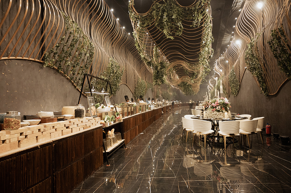 1. The Grand Ballroom: This meticulously designed hall spans an impressive 45,000 sq. ft., offering versatile capacity to accommodate between 300 and 2,500 guests with ease. It features two distinct stages: a dedicated bride and groom stage and a performance stage along with an attached dining area. Adding a unique touch to the venue is the nature-inspired ‘transparent river’ flooring, creating an enchanting and memorable atmosphere.