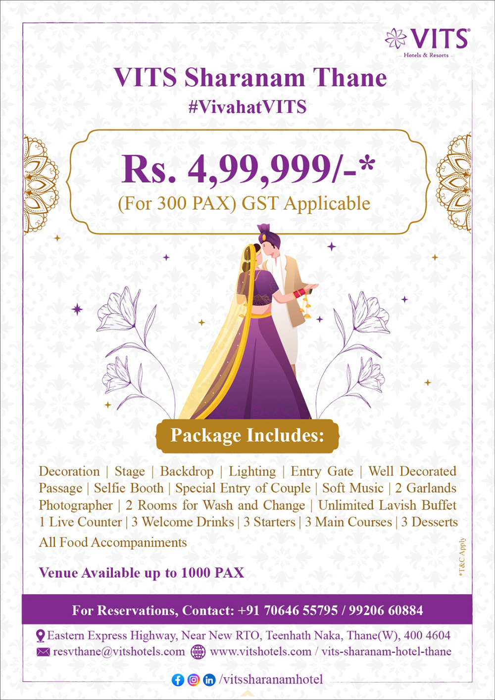 Situated at a pristine location just a 10-minute drive from the Thane Railway Station, VITS Sharanam Hotel is one of the best luxury hotels in Thane. A boutique property with 30 rooms and suites and a choice of both indoor and outdoor venues, it is ideal for both intimate family gatherings and grand weddings, offering the best of services and ease of access for guests both outstation and from across the city.