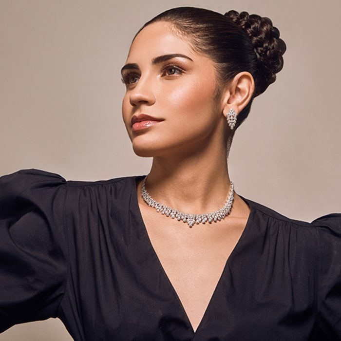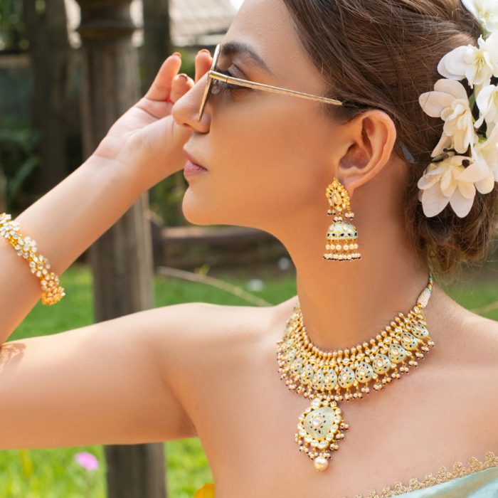 - Ensure that the neckline, sleeves and hem of your bridal outfit match the style of your wedding jewellery. For example, wearing a long ornate necklace over a heavily embellished blouse will dilute the impact of the overall look. You are better off with a beautiful choker around your neck and a deep neck blouse which will showcase the beauty of the outfit and the choker independently.