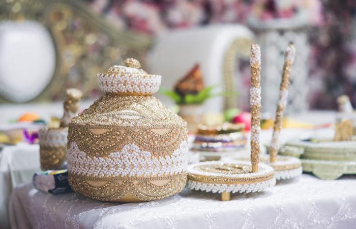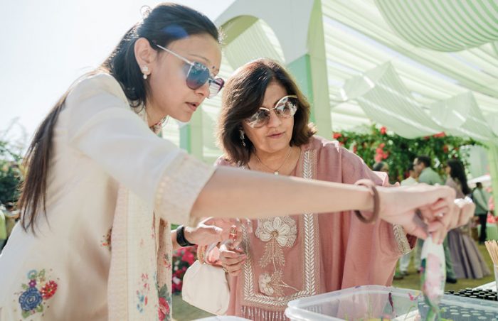 Another option is to create interesting setups that are vibrant and engaging for events such as the mehndi, haldi or sangeet. Some popular ideas for themed wedding favors include sets of pretty bangles/earrings/ maang tikkas handed out from brightly decorated carts alongside ornamental clutches or ethnic shoes, tie and die dupattas, and more.